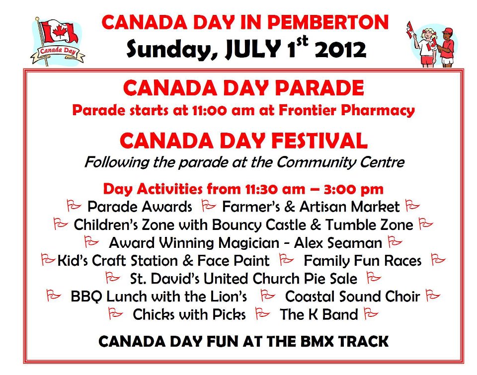 Event: Canada Day Celebrations June 30, 2012 Alas, no Spud Run this year. But here’s a round-up of activities taking place in downtown Pemberton tomorrow. Share this: Share on X (Opens in new window) X Share on LinkedIn (Opens in new window) LinkedIn Share on Facebook (Opens in new window) Facebook Share on Pinterest (Opens in new window) Pinterest Email a link to a friend (Opens in new window) Email Share on Tumblr (Opens in new window) Tumblr Like Loading... Related Published by Lisa Richardson View all posts by Lisa Richardson
