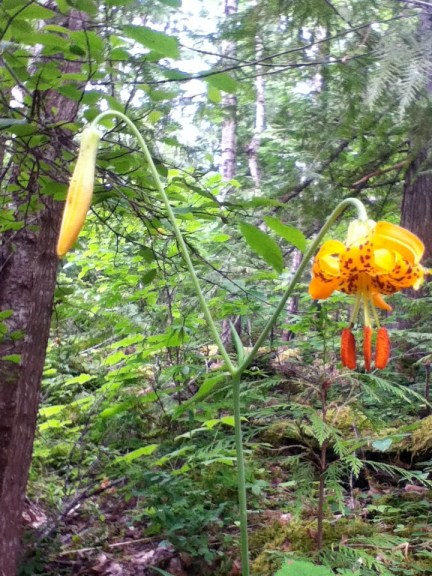 The Tiger Lily (Lilium columbianum) is one of BC’s ‘day lilies’ – short flowering, and in the final days of its show-off phase now – spotted around Mosquito Lake early this week, typical habitat given tiger lilies are most likely to be found in open damp woods and meadows. (One of the favourite places seems to be the cleared swaths along highways, where trees have been removed, but there is low shrub cover.)