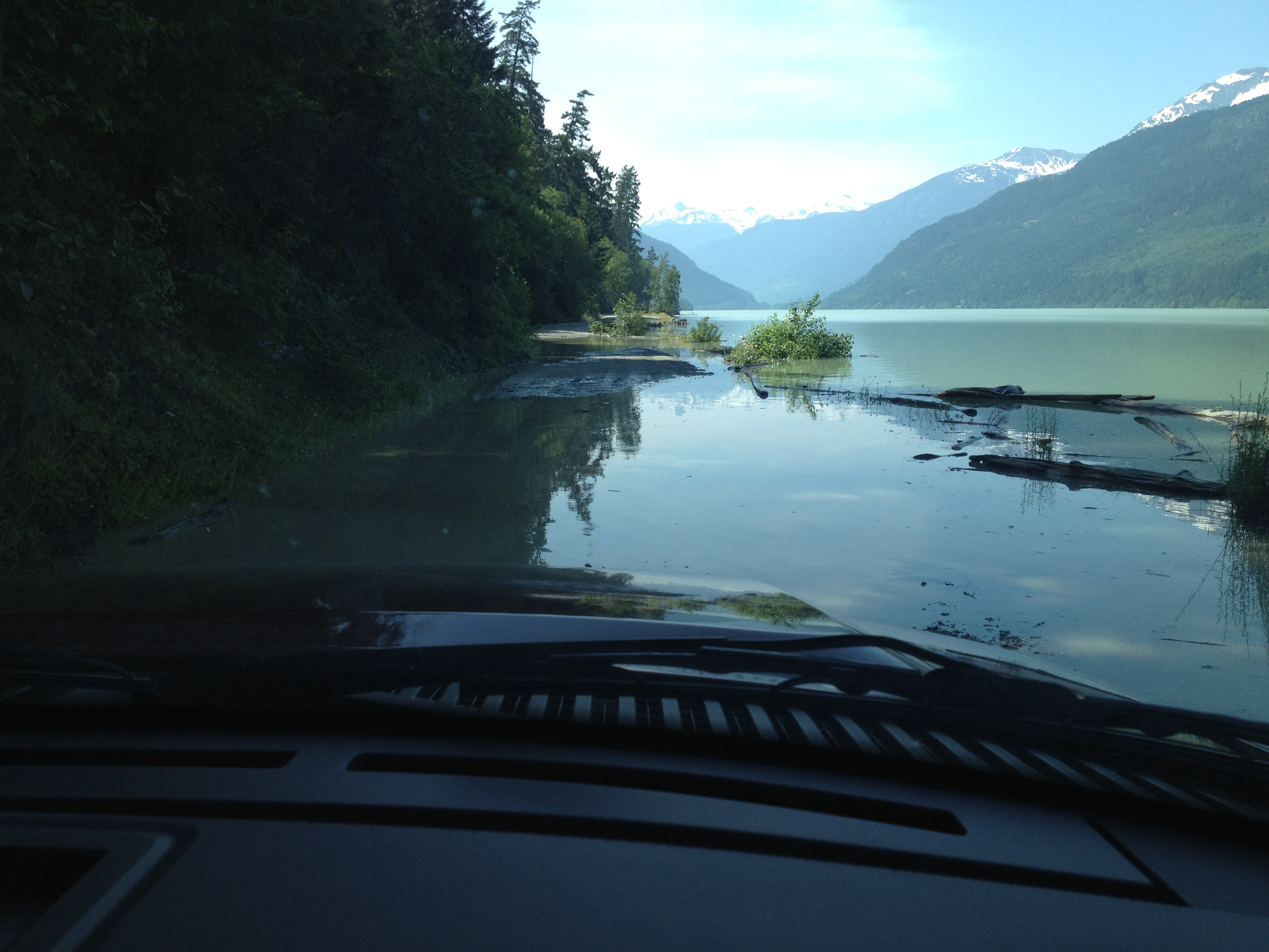 Warm summer weather, snow in alpine melting, rain over the week-end, it all adds up to one thing… Lillooet Lake on the rise! This photo (taken July 17) shows that the lake has spilled onto the forest service road (again!) in places. The road is impassable to small cars. Drive with care!