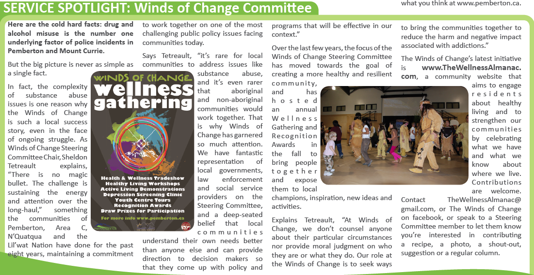 The Winds of Change Committee is featured in this week’s edition of the Pemberton Page. Pick up a copy of the Question to check it out for yourself or or read a more detailed interview with Winds of Change Steering Committee Chair, Sheldon Tetreault at Choose Pemberton.
