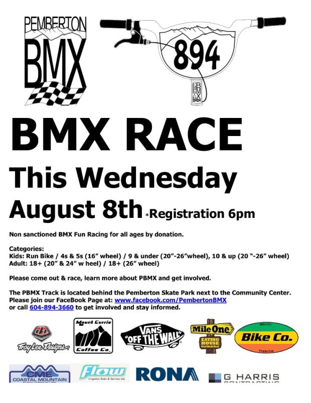 Event: Pemberton BMX Bike Race, Wed Aug 8, 6pm. All ages! August 7, 2012 Share this: Share on X (Opens in new window) X Share on LinkedIn (Opens in new window) LinkedIn Share on Facebook (Opens in new window) Facebook Share on Pinterest (Opens in new window) Pinterest Email a link to a friend (Opens in new window) Email Share on Tumblr (Opens in new window) Tumblr Like Loading... Related Published by Lisa Richardson View all posts by Lisa Richardson