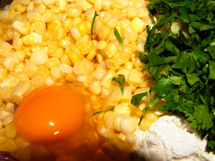 - Place 2 cups of the corn kernels and the onion, eggs, coriander, flour, baking powder, salt and pepper in a food processor and process until combined.