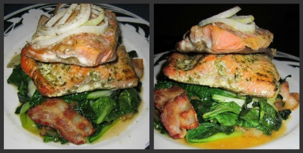 A White Wine, Dill Weed, Citrus Birken Head River Sockey Fillet & A Creamy Pesto, Siracha Blend local Sockeye Fillet on a bed of Bacon and Garlic Sauted local organic Kale Greens.