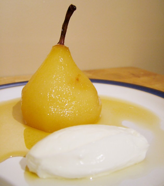 6. Stand 1 pear on each plate and evenly spoon the syrup over pears. Add spoonful of drained yogurt to each plate.
