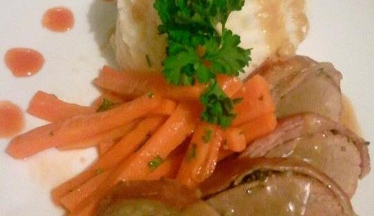 This is a bacon-wrapped, seasoned fresh Venison Tenderloin Cutlet (tsi7) dish, sided with 4 Cheese Garlic, Miller Mashed Spuds and Catalina-Maple marinated Carrots, topped with roast dripping gravy!