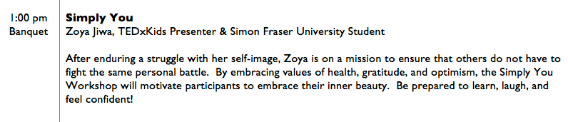 At age 18, Zoya is an open-minded leader, a dedicated volunteer, and a caring humanitarian. Zoya believes that true beauty comes from within. In August 2011, she founded the Simply You Program at Dr. Charles Best Secondary, which is designed to empower youth to recognize their leadership capabilities and embrace their inner beauty. The Simply You Program is currently expanding to other schools in School District #43. Zoya’s accomplishments include being a TEDx speaker, running as a torchbearer in Vancouver’s 2010 Winter Olympic games, and being a recipient of the Terry Fox Humanitarian Award. In addition, Zoya has contributed hundreds of volunteer hours to her community. Zoya finds great happiness in making others smile.