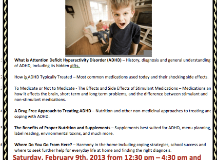 The workshop will cover: ADHD, or Attention Deficit Hyperactivity Disorder and the history of the diagnosis, how ADHD is typically treated and some of the side effects of the most commonly prescribed medications, and present nutrition and other non-medicinal approaches to treating and coping with ADHD, as well as various coping strategies for families living with ADHD.