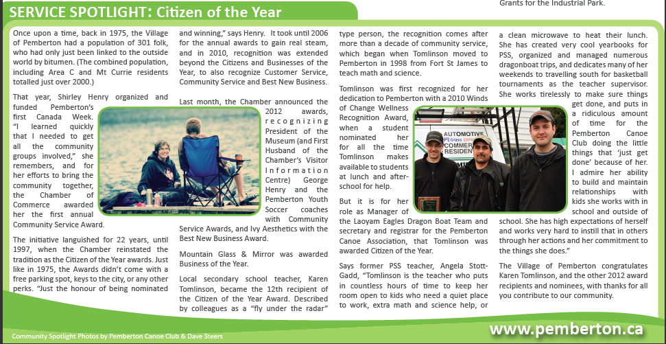 But it is for her work as Manager of the Laoyam Eagles Dragon Boat Team and secretary for the Pemberton Canoe Association that she was recognised as Citizen of the Year.