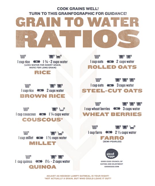 If you like to whip up a pot of quinoa, millet, or brown rice for weeknight suppers, then we have just the infographic for you. Print this out — put it on your fridge, and you’ll have the right ratios of grain to water right in front of you. More