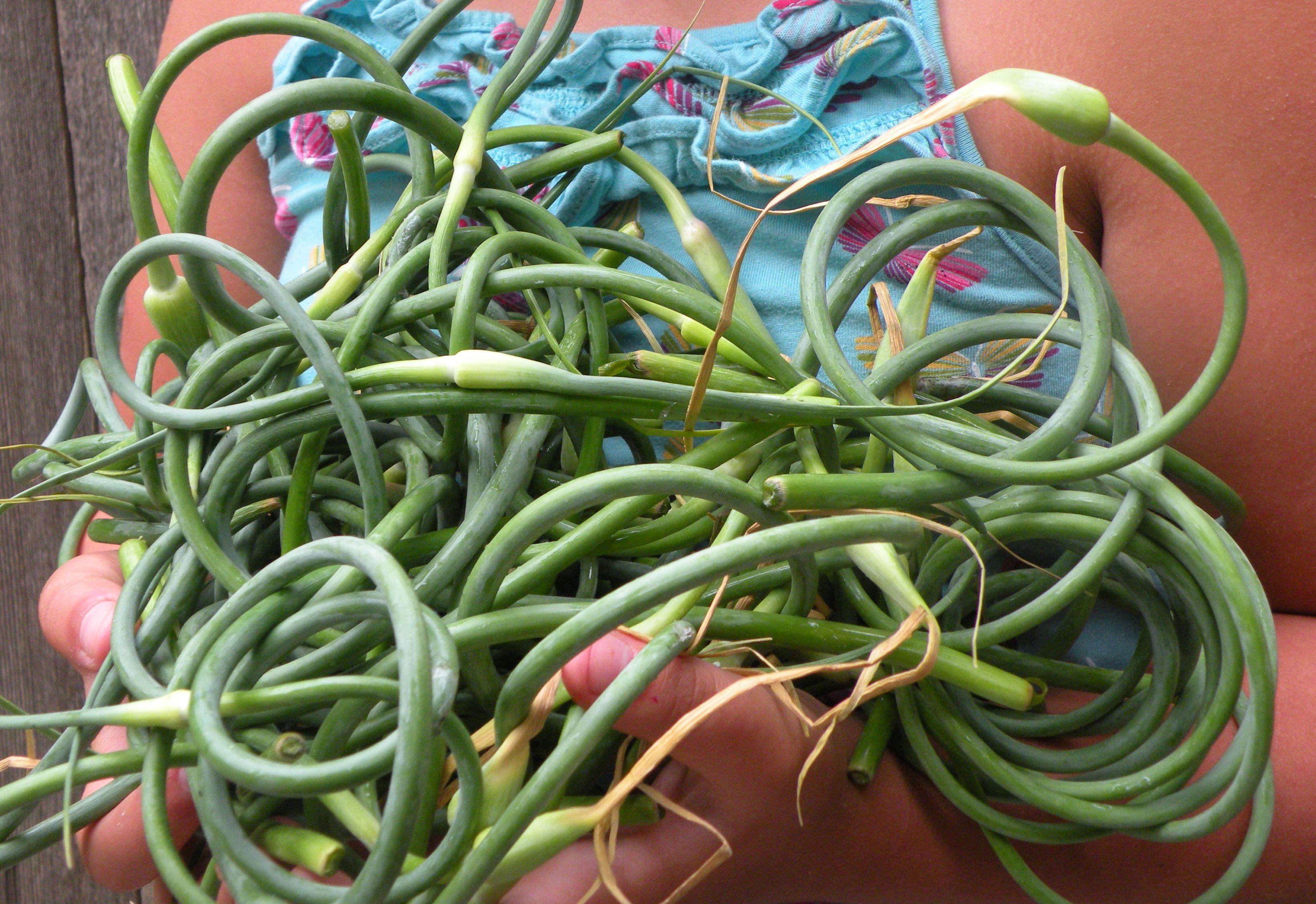 Garlic scapes are the flower of the garlic plant. These curly, deep‐green stalks are