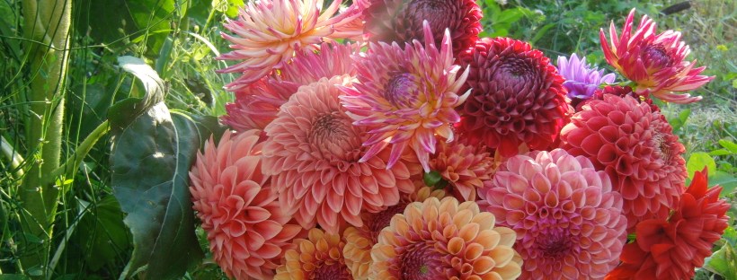 The best time to plant this group of flowers is in when your soil temperatures are at least 20 degrees – roughly around the same time you would plant tomatoes. Last year Sam and I planted ours out in the second week of May. You can lay down black plastic or landscape fabric to warm the soil if you want to get an early start. If you are really keen, go ahead and start some inside in pots but don’t water them too much. Just a light misting will do the trick. The nursery in town has some nice dahlias in stock now – if you are looking to try them out this year, head on over and take a gander. We like the smaller-sized dahlia: they are much more prolific, which is good for us and they tend to flower sooner . We did snatch up some dinner-plate sized ones as well this year, so watch out! Don’t forget: if you want your dahlias to be as big as your face or a plate you will have to dis-bud. (I will explain disbudding at the end of this post.)