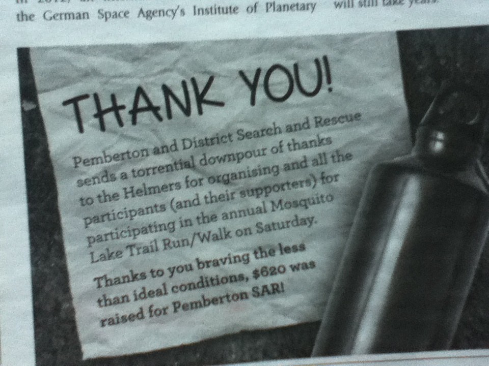 Shout-Out: PEMSAR and the Mosquito Lake Runners May 7, 2013May 6, 2013 Loved this shout-out from Pemberton Search and Rescue in the Pique last week. Next up, the Canada Day Spud Run. (And a chance to battle another extreme of Pemberton weather…) Share this: Share on X (Opens in new window) X Share on LinkedIn (Opens in new window) LinkedIn Share on Facebook (Opens in new window) Facebook Share on Pinterest (Opens in new window) Pinterest Email a link to a friend (Opens in new window) Email Share on Tumblr (Opens in new window) Tumblr Like Loading... Related Published by Lisa Richardson View all posts by Lisa Richardson