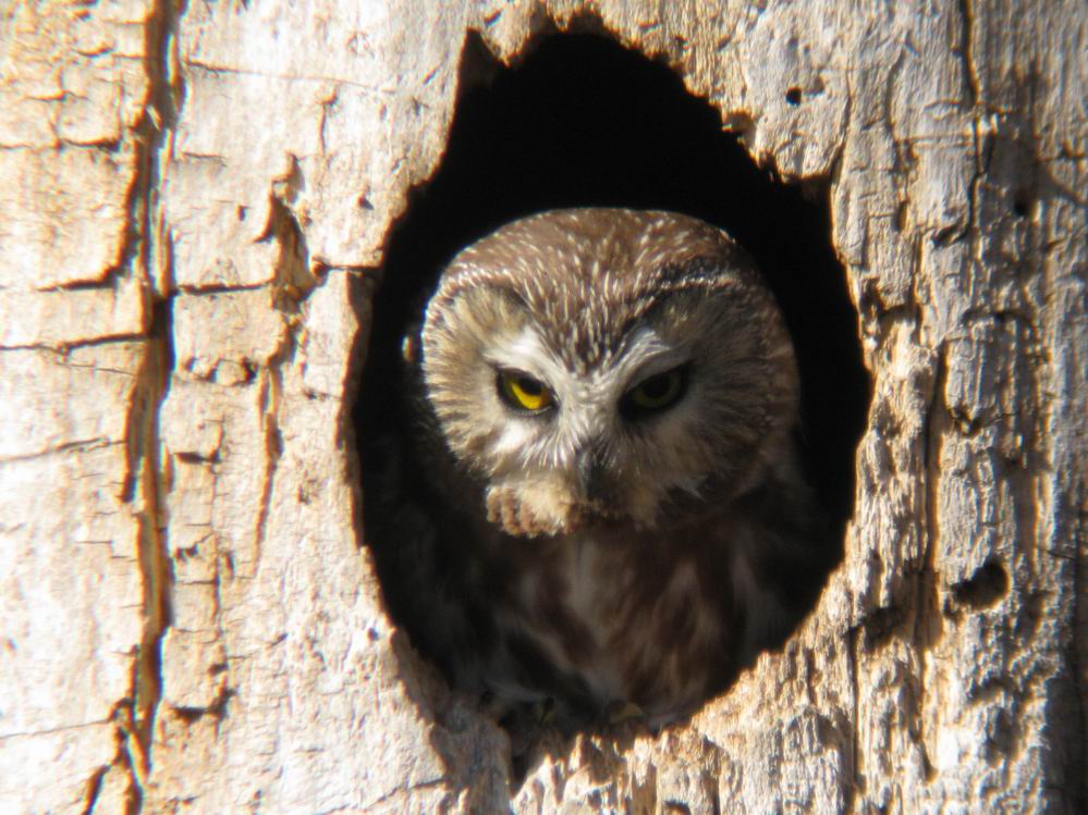 Saw-whet owl males choose and defend territories and call to attract females. The females choose the nest cavity, often an old nest hole made by a Northern Flicker or Pileated Woodpecker.
