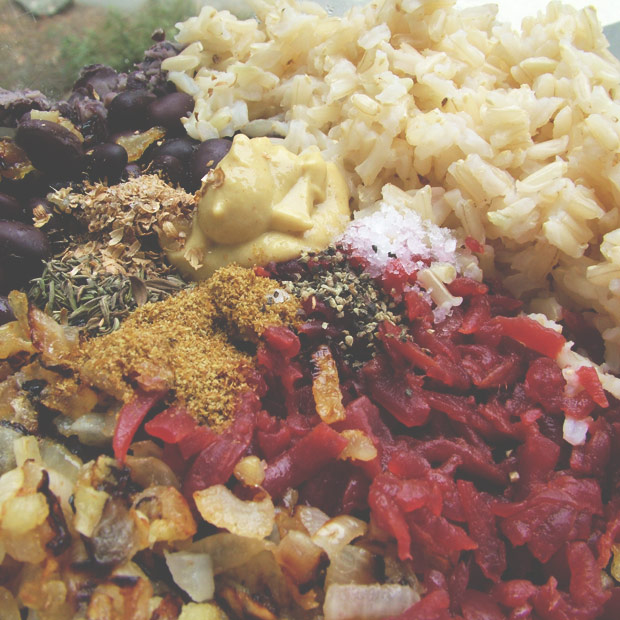 - Transfer the squeezed beets, cooked rice, and sautéed onions to the bowl with the beans. Sprinkle the olive oil, brown mustard, smoked paprika, cumin, coriander, and thyme over the top of the mixture. Mix all the ingredients until combined. Taste the mixture and add salt, pepper, or any additional spices or flavorings to taste. Finally, add the oatmeal flour and egg (if using), and mix until you no longer see any dry oatmeal or egg.