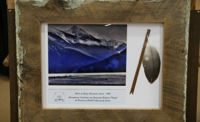 The awards are a real local creation. Dave Steers has donated a beautiful photo from the Pemberton Valley each year. Allan Leblanc has sourced old local barn boards for the frame. Lois Joseph from the Lil’wat Cultural Centre has had a hand-made cedar strip or beaded feather made which sits inside the frame. They are a beautiful symbol of the collaboration of the Winds of Change as well as a celebration of place.