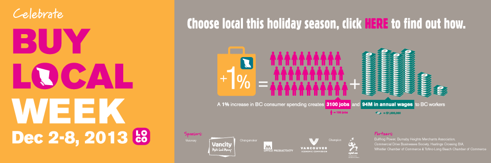 According to LOCOBC, a 1% increase in BC consumer spending would create 3100 jobs and $94 million in wages… One percent won’t make or break your holiday budget, but if we all made the effort, it could make a big difference.