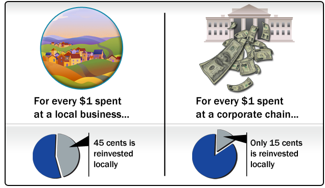 It is inspired by the Local Multiplier Effect, which indicates that, for every dollar spent at a local business (instead of at a corporate chain), 45 cents is reinvested locally.
