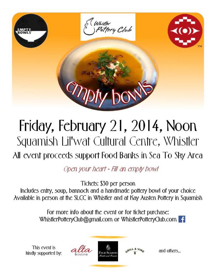 Empty Bowls will take place at the SLCC on Friday, Feb. 21. Tickets are $30 from the SLCC, at Kay Austen Pottery in Squamish or at whistlerpotteryclub@gmail.com.