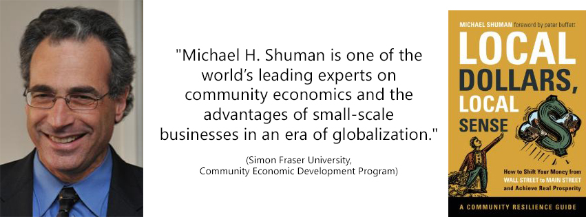 Register for the event and you will be entered into a raffle to win a signed copy of Michael Shuman’s latest book ‘Local Dollars, Local Sense’ at the event.