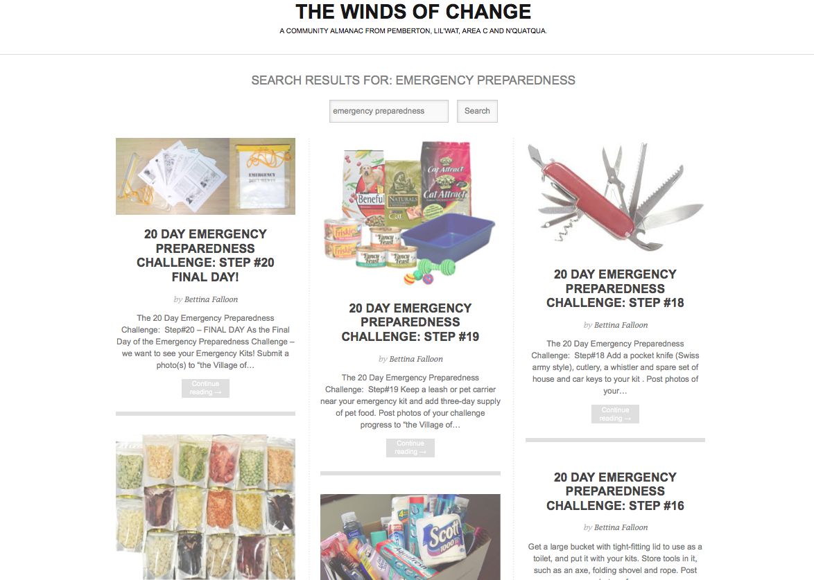 For 20 days in May, Pemberton’s Emergency Program Coordinator, Bettina Falloon, posted a step-by-step plan to get your preparedness on, to TheWellnessAlmanac.com.
