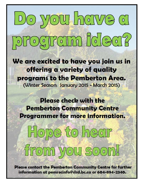 If you have any questions, contact us at 604-894-2340 or email at pemrecinfo@slrd.bc.ca
