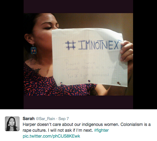 It makes me think of the way First Nations women across Canada have evolved the #AmINext campaign, a call to the Harper Government to a order Royal Commission into missing and murdered aboriginal women. Lil’wat Chief Lucinda Phillips invited Lil’wat women to join the movement, and post selfies on social media saying #I’mNotNext.