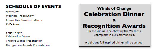 The 5th annual Wellness Gathering will feature the always popular Wellness Trade Show, live interactive demonstrations, fun for the kids and a celebration dinner. The Cultural Centre will open for the event. The Wellness Trade Show and interactive demonstrations will take place from 1pm-5pm with the celebration dinner following. The celebration dinner will also include the Recognition Awards Ceremony.