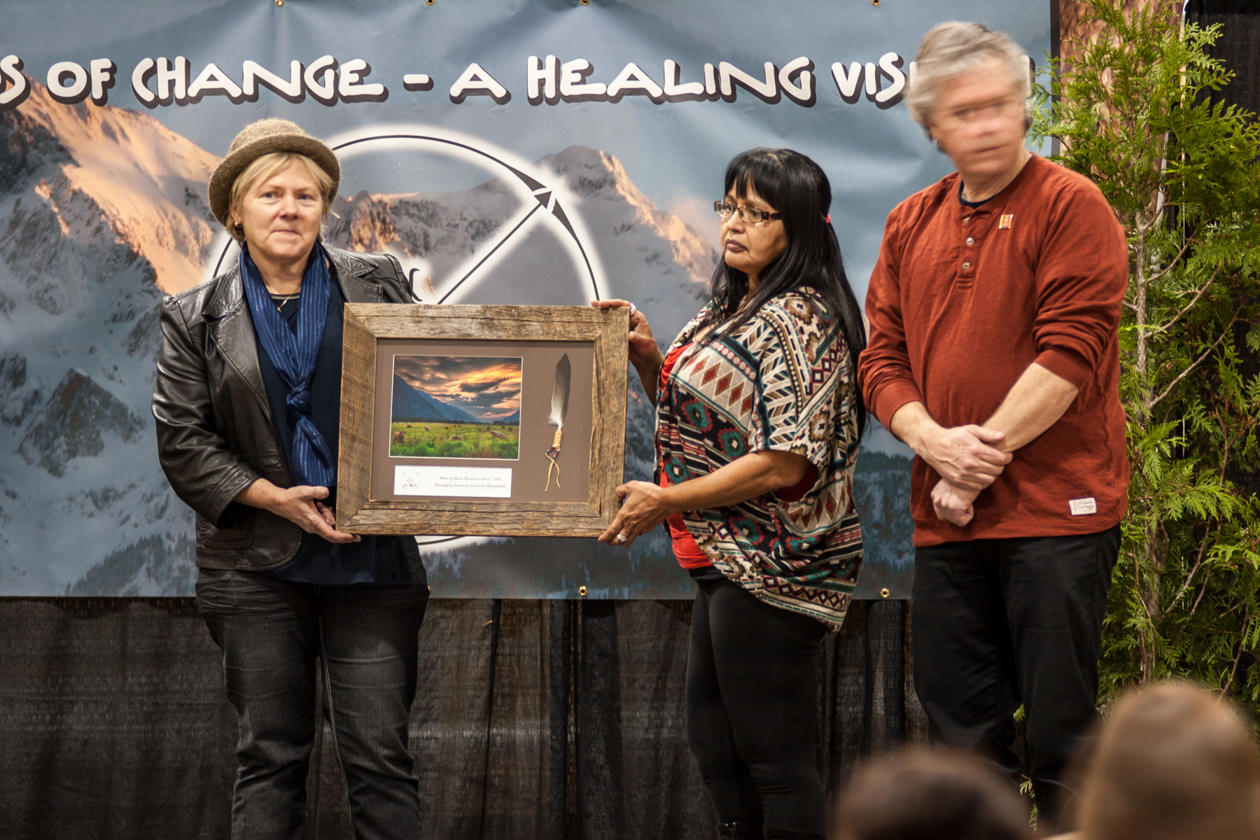 Retiring Area C Director Susie Gimse, Lil’wat Nation Councillor Joanne John, and Village of Pemberton Councillor James Linklater, hold up the award for the first highschool student to win a Winds of Change Recognition Award, Cassie Dan.