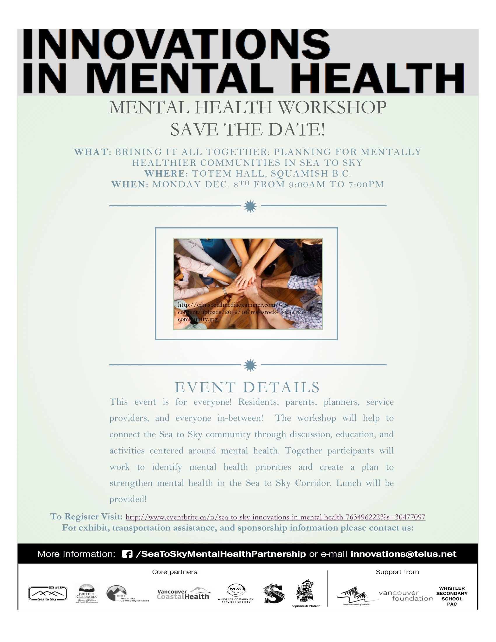 The Innovations in Mental Health Partnership is hosting a workshop on December 8th to identify community mental health priorities for the Sea to Sky Corridor. The workshop is open to residents, parents, employers, planners, service providers… They want to hear from everyone!