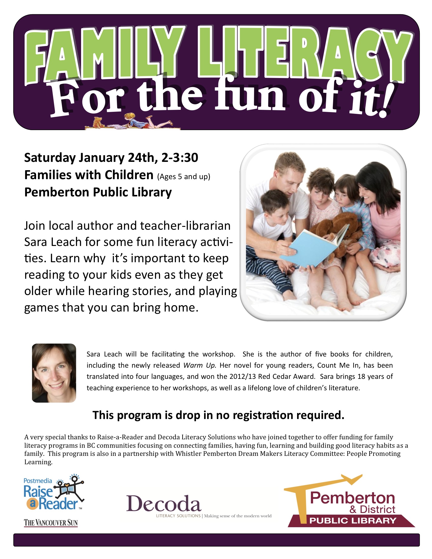 On Saturday January 24th, we have a Family Literacy program for families with children aged 5+. This program is free to attend and is facilitated by local author Sara Leach.