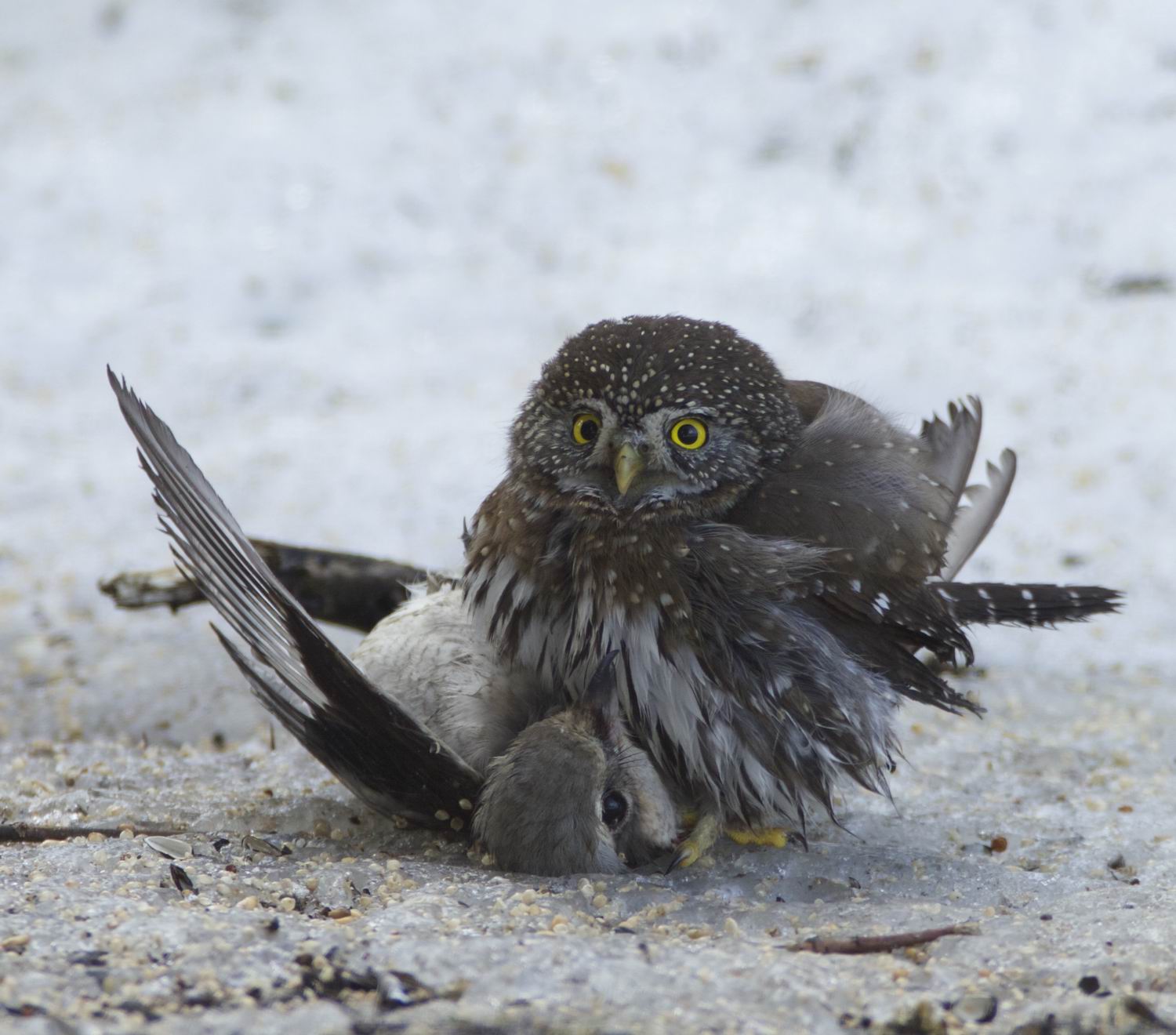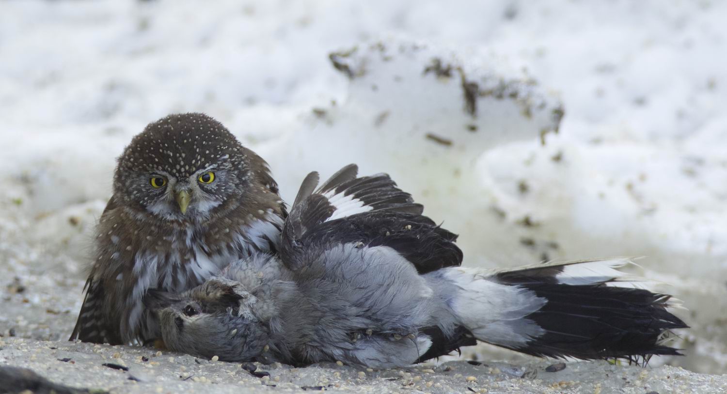Thanks to the skills of Gary Sobchak, we have some incredible pictures of an attack by a Pygmy Owl on a Northern Shrike. The Shrike did turn into dinner for the Owl. It happened Friday Jan. 30 at Meadow Rd. and Miller Cr. Many years may pass, before an event like this will be documented again. Well done, Gary!