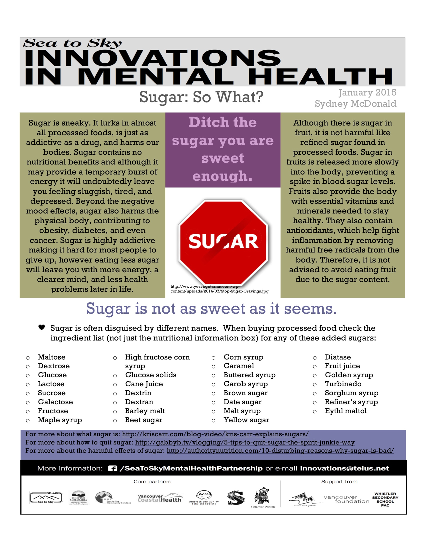 I must admit that I felt sorry for the potato back when it was fell out of favour – but now avoiding sugar is the flavour-of-the-month, and the idea of paying more attention to what I eat, in order to consume less sneaky sugar, is slowly growing on me. Laura Zgud planted the seed during her 50 Day Wellness Challenge, and now Sydney McDonald, blogger for the Sea to Sky Mental Health Partnership makes the link between a healthy mind and attitude and a powerful sense of wellbeing with cutting back on the sweets. Must be a call to inject more “sweet stuff” into life in other ways – snuggles with kids, quality time with friends, beautiful fragrances from the garden…