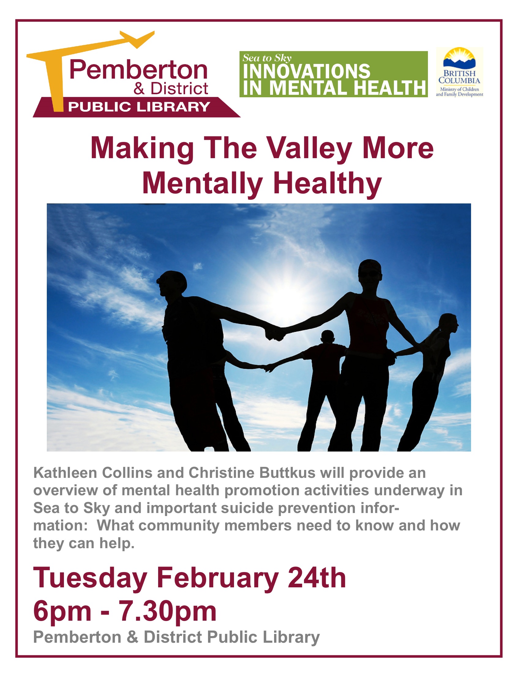 A speaker series in partnership with the Pemberton Public Library on various mental health topics launches on Tuesday, February 24, at 6pm.