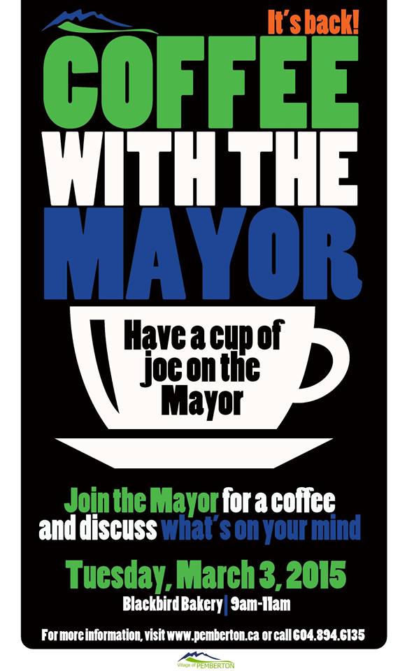 Getting dangerously caffeinated is just one of those occupational hazards for the Mayor of Pemberton. Mayor Mike Richman takes up the community engagement torch, and will be available at Blackbird Bakery from 9am to 11am, to shout you a brew, and shoot the breeze or answer questions about any municipal issues you might want to discuss. So, what’s on your mind?
