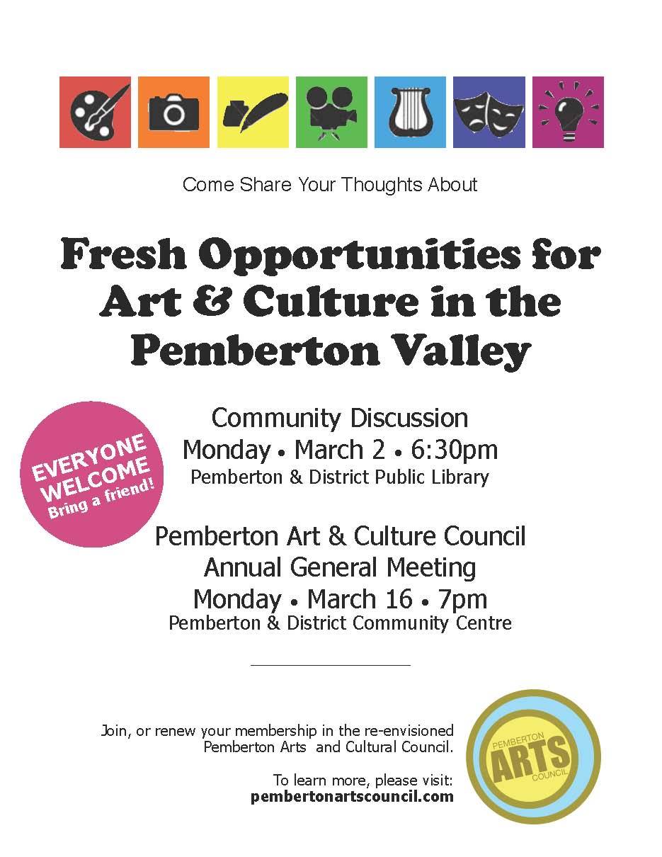 By attending you will learn about the expanded role and new directions the Pemberton Arts and Culture Council are planning for 2015. This is the work the Cultural Round Table Committee in collaboration with the current board of the Pemberton Arts Council.