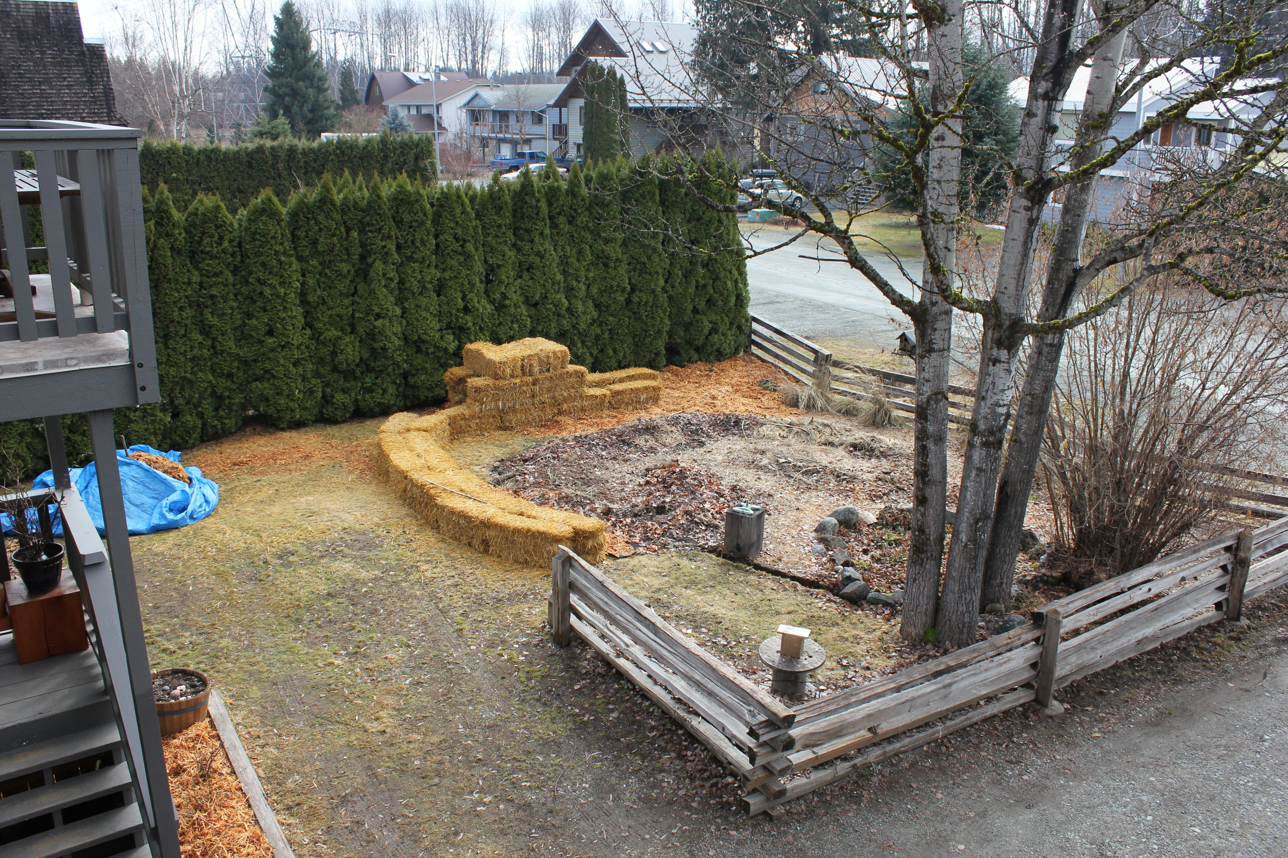 One of the big ingredients in sheet mulching is straw. So I decided to try straw bale gardening this year, so when I expand my lasagna beds again next year, I will have this partially decomposed, recycled straw to work with. Also, I am feeling a bit lazy and love the experiment factor. So here we go – straw bale garden. In his book Mr. Karsten encourages a lot of fertilizer be added to the bales, but my plan is to use half the organic fertilizer he calls for, and add manure. My kids have convinced me to leave some of it as a shelter/play structure with a living roof. I am willing to be the neighbourhood guinea pig. I was skeptical about lasagna gardening too, and now I would never go back to “other” styles.