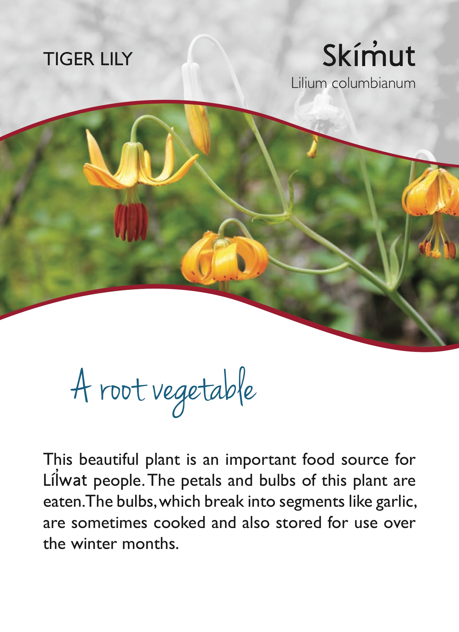 We are so thrilled to dedicate the month of April at the Wellness Almanac to showcase Stewardship Pemberton’s native plant garden interpretive sign project. Check out Dawn Johnson’s post, to find out where it all began. And stand by, every day, as we share a native plant. It’s a chance to test your local knowledge, put words to the world around us, and share the deep wisdom of the Lil’wat Nation, who have been here since time before memory.