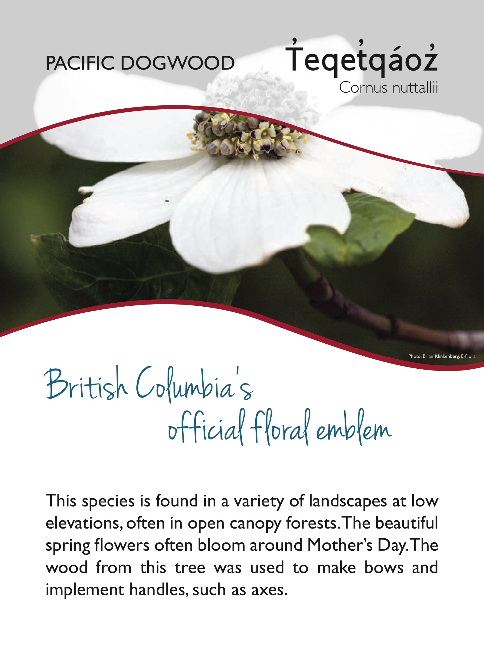 Included, is the Pacific Dogwood, a protected plant in BC. In May and June, if you’re walking/running/riding along the Sea to Sky Trail, between One Mile Lake and Nairn Falls, you’ll pass several dogwoods in flower.