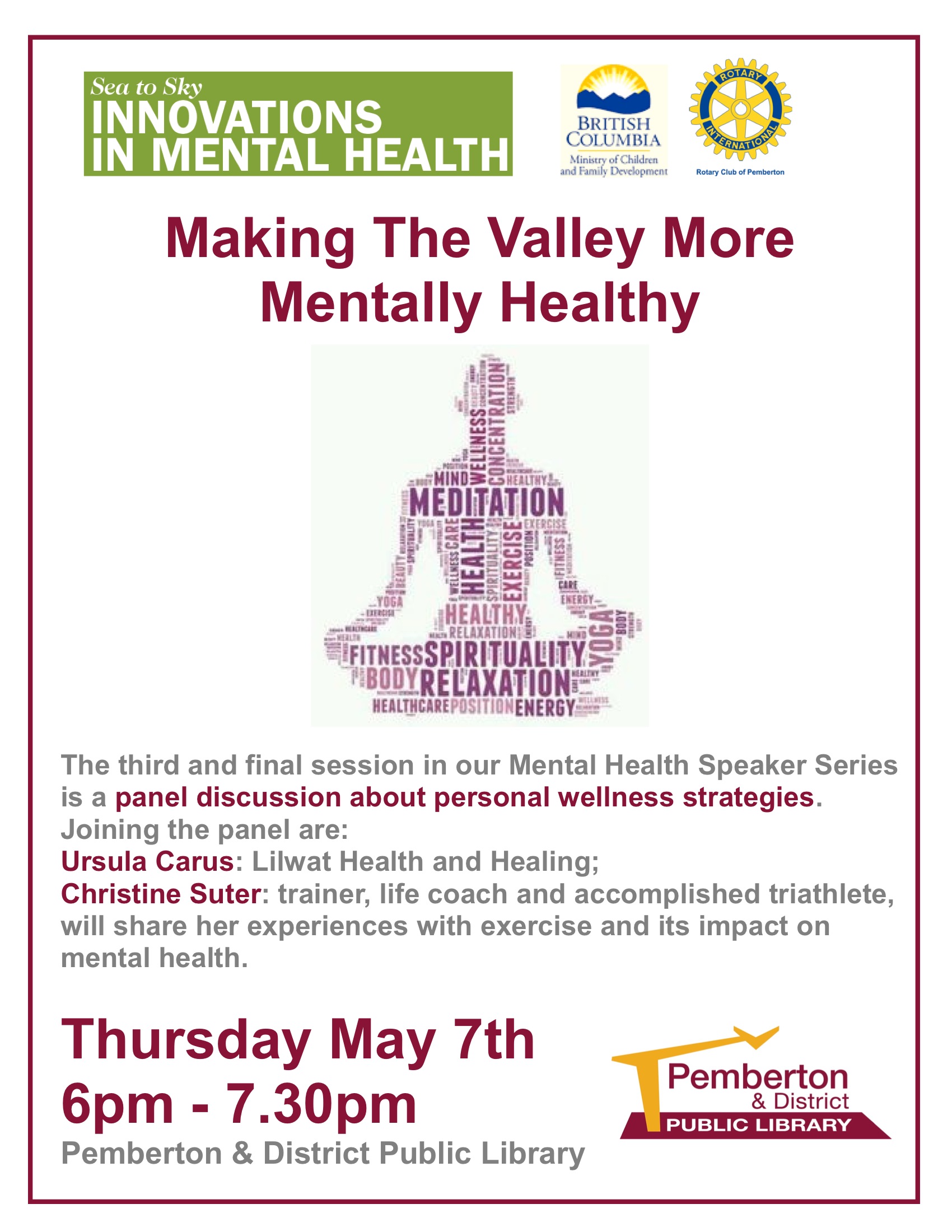 The panel discussion and presentation about personal wellness strategies is the third and final in the Mental Health Speaker Series.