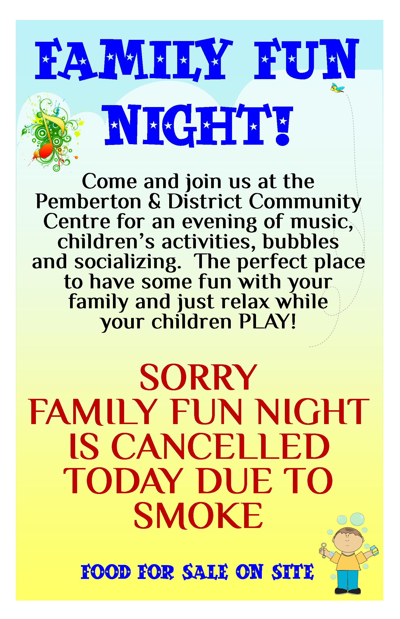 CANCELLED! Update: Tonight’s Family Fun Night at the Community Centre July 7 is cancelled.