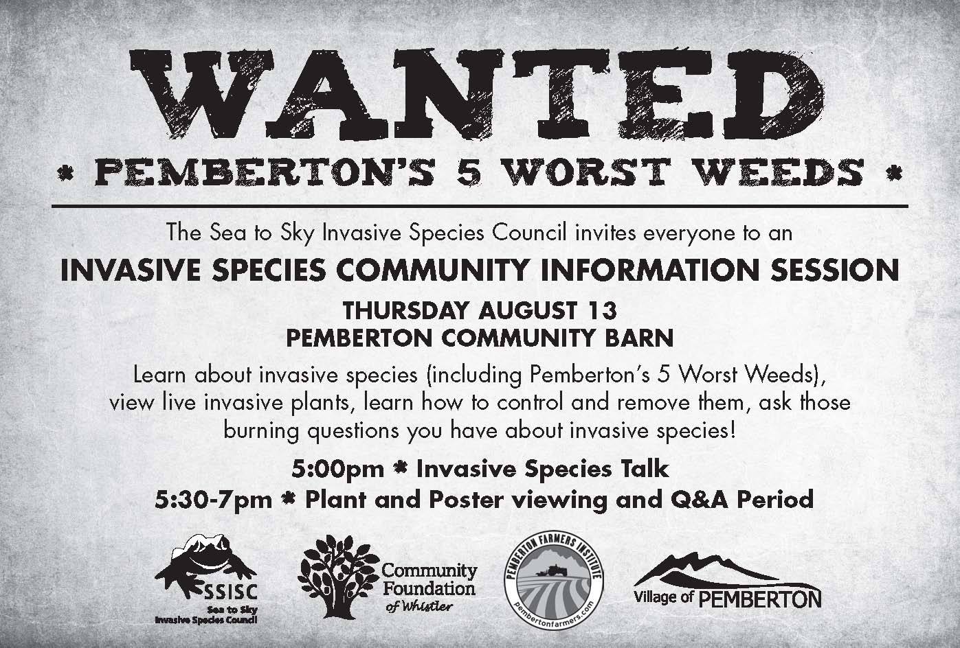 Don’t let the bad guys get you down. Rip ’em out at the roots. Learn How: Thurs 13th August, 5pm August 12, 2015August 9, 2015 Information session on Thursday 13th August from 5pm by the Sea To Sky Invasives at Pemberton Downtown Barn. Share this: Share on X (Opens in new window) X Share on LinkedIn (Opens in new window) LinkedIn Share on Facebook (Opens in new window) Facebook Share on Pinterest (Opens in new window) Pinterest Email a link to a friend (Opens in new window) Email Share on Tumblr (Opens in new window) Tumblr Like Loading... Related Published by Lisa Richardson View all posts by Lisa Richardson
