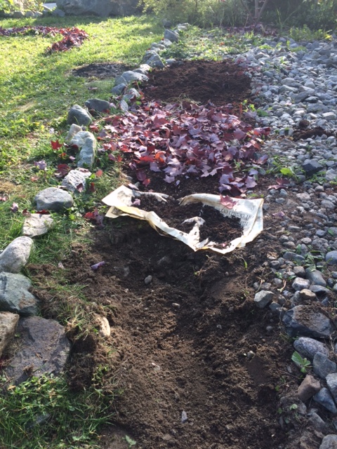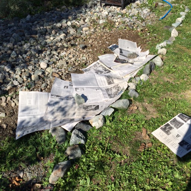 So as not to disturb the vital microorganisms already in the soil, lasagne gardens avoid toiling and tilling. Simply alternating carbon-rich ‘brown’ items (such as newspaper, sawdust or dried leaves) with nitrogen-rich ‘green’ items (kitchen vegetable scraps, eggshells, coffee grounds, etc) gives these micro organisms all that they require (warmth, moisture and extra nutrients) to create compost in no time. I started gathering said items: collecting out-dated newspapers from work, raking fallen crimson-coloured maple leaves, shoveling the horse manure left on the path behind my house (what’s that they say about lemonade?), mushroom compost and a big bag of soil.