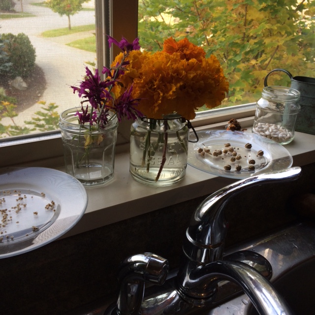 Being the quasi-pseudo-farmer that I like to pretend I am, I’ve been busy the past few weeks pulling diseased plants, planting garlic cloves, raking leaves to use as mulch, sowing cover crops such as hairy vetch and fall rye, fermenting tomato seeds and gathering seed heads to fill my windowsill with little plates of dried bits and pieces.