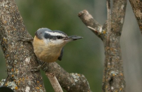 The Red Breasted Nuthatch has been visiting regularly, taking one sunflower seed at a time from the feeder, then flying with that seed to another tree, where it wedges the seed in a crack. Sometimes the bird uses the grip of the tree to hold the seed in place so it can get at the food within and other times it just leaves the seed for later.