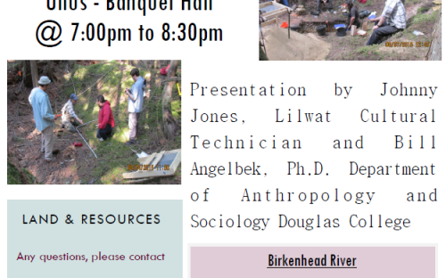 To celebrate this important breakthrough, the Lands and Resources department is hosting a community presentation on Thursday, May 12 at 7 pm at the Banquet Hall of Úll’us a Community Complex. Lil’wat Cultural Technician Johnny Jones will be joined by Dr. Bill Angelbeck of Douglas College’s Department of Sociology and Anthropology to discuss the cultural and social relevance of the findings.