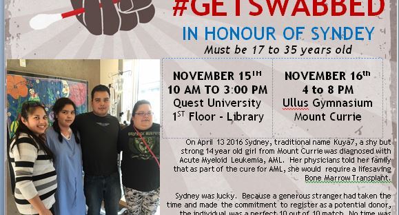 Sydney was fortunate enough to find a perfect bone marror donor match. Saving a life might be in you, too. If you show up to the Mt Currie gym on Wednesday between 4pm and 8pm, you could get swabbed and register to donate stem cells to someone in need of treatment.