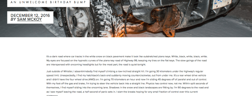 Just outside of Whistler, I absentmindedly find myself climbing a low-inclined straight hill. I’m going 30 kilometers under the highway’s regular speed limit. Unexpectedly, I find my hatchback’s back end suddenly moving counterclockwise, out from under me. It’s a rear wheel drive vehicle and I didn’t have the four wheel drive (4WD) on. I’m going 70 kilometers an hour and now I’m sliding 45 degrees off of parallel and out of control. With my foot off the gas and brake, I’m trying to steer the vehicle back into a straight line. Physics has control now, not me. Within split seconds of themselves, I find myself sliding into the oncoming lane. Shadows in the snow and black landscapes are flitting by. I’m 90 degrees to the road and as I see myself leaving the road, a half second of panic sets in. I slam the brakes hoping for any small fraction of control over this current nightmare.