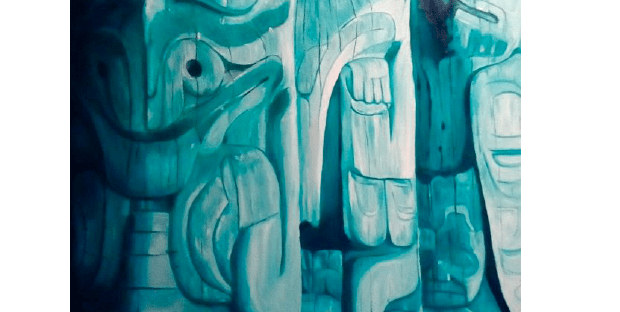 In times of sorrow and need we look to our family, our people, and our fellow man for support. Three totem poles stand behind one another as literal pillars of strength, offering support and protection, ever reminding us that our ancestors are watching over us and those in need. From our animal brothers we gather teachings of wisdom, strength, and hope. The Bear, who has taught my people about medicinal plants, and has shown my ancestors lands where the water runs pure and the gardens of the forest are most plentiful; where berry patches and fishing holes are at their most fruitful, to him we give thanks; the Raven, who gave light to the world and has given valuable lessons through fable and regal curiosity, who offers insight and practical wisdom, we are grateful; and the Eagle, who soars high watching over us, carrying our hopes and prayers to the skies, lives as a dignified example of grace and quiet strength. The calming colours of emerald green and viridian hues, serve to soothe the viewers and passers-by, and offer strength and inspiration to every man and woman who work tirelessly to bring good health and healing to the people they serve, may they find it in my painting Anthropology. It is from the teachers who have come before us, passing down their discoveries in medicine and healing where this painting gathers its inspiration. Three ancient totem poles from Haida Gwaii stand strong, one behind the other, at UBC’s Museum of Anthropology, from where I was inspired to create this work of mine. With it, it carries good medicine.