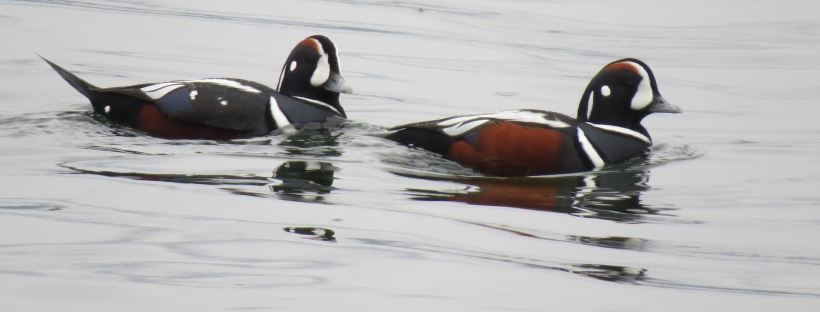 The Gulls were most numerous. Next came Double crested Cormorant. Common Merganser, Harlequin Ducks, Goldeneyes. A Bald Eagle kept a watchful eye on everybody. A Seal was floating near shore. The Harlequins were posing for pictures and the Oystercatchers were at the next beach south, at Brunswick Beach.