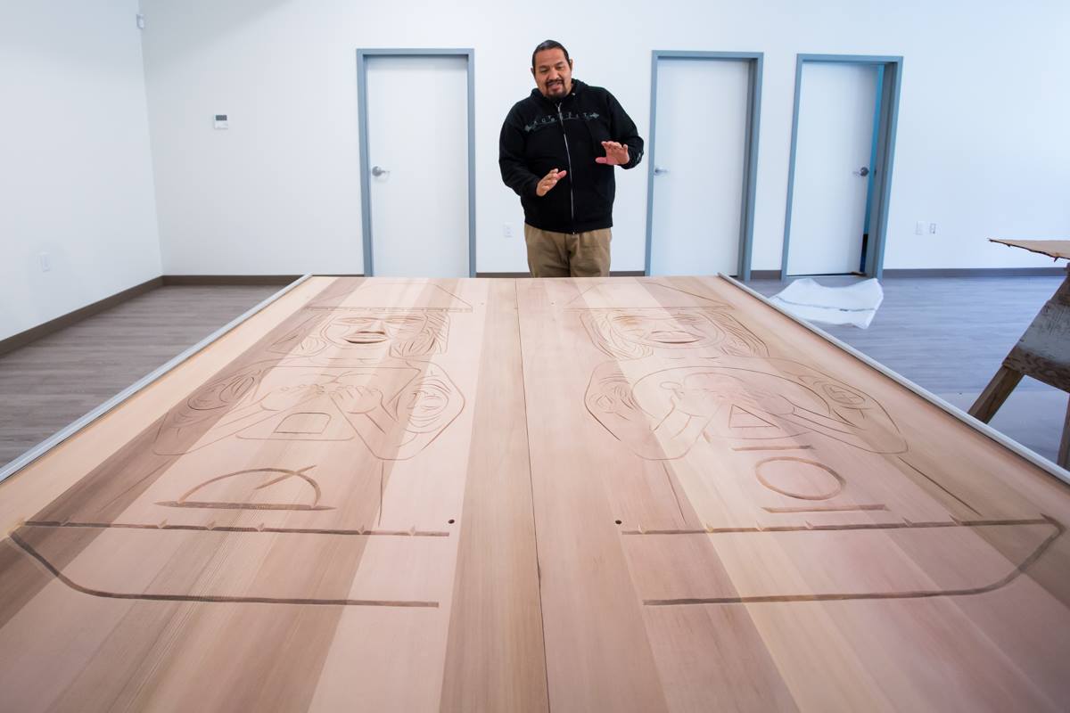 Doors to the Tzsil Learning centre carved by Ashley Gepcal Joseph photo courtesy Murphy Construction Previous Next Published July 26, 2018 at 1200 × 800 in The work is complete: Ashley Gelpcal Joseph’s entry doors for the Ts’zil Learning Centre